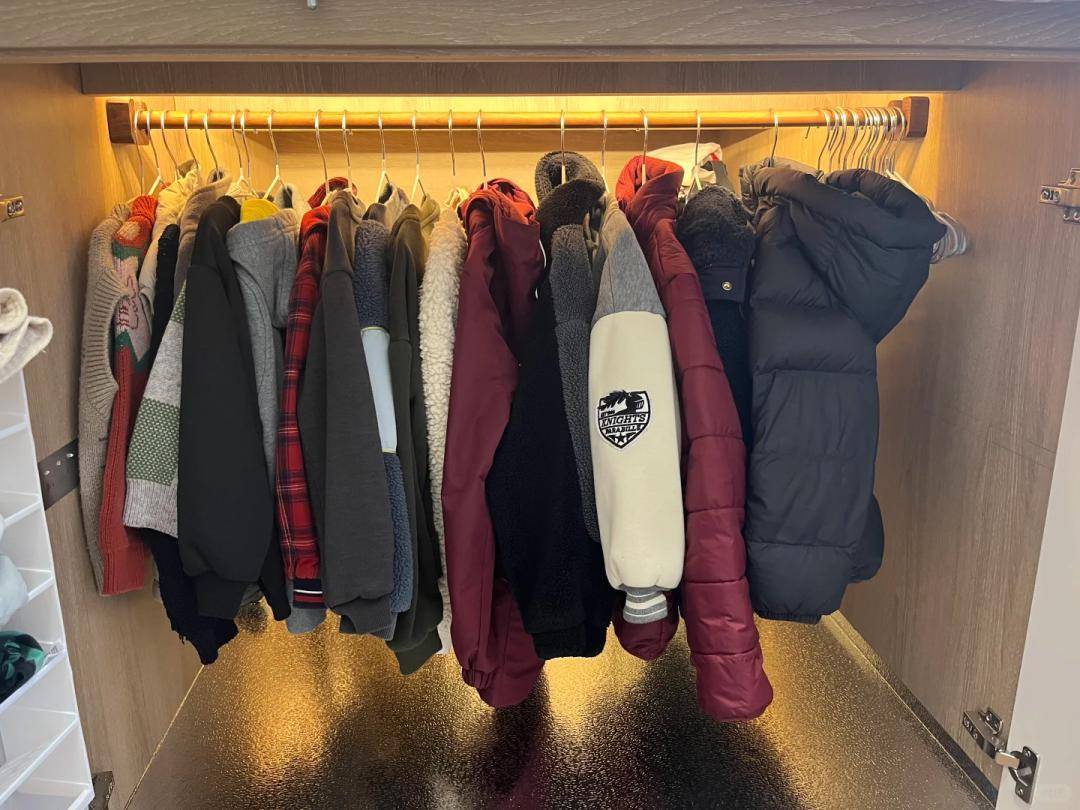 日常穿的外套、睡衣随手挂,不用来回跑衣柜;外侧双层抽屉专门收玩具、围巾、换季衣物,每个物件都有专属位置。