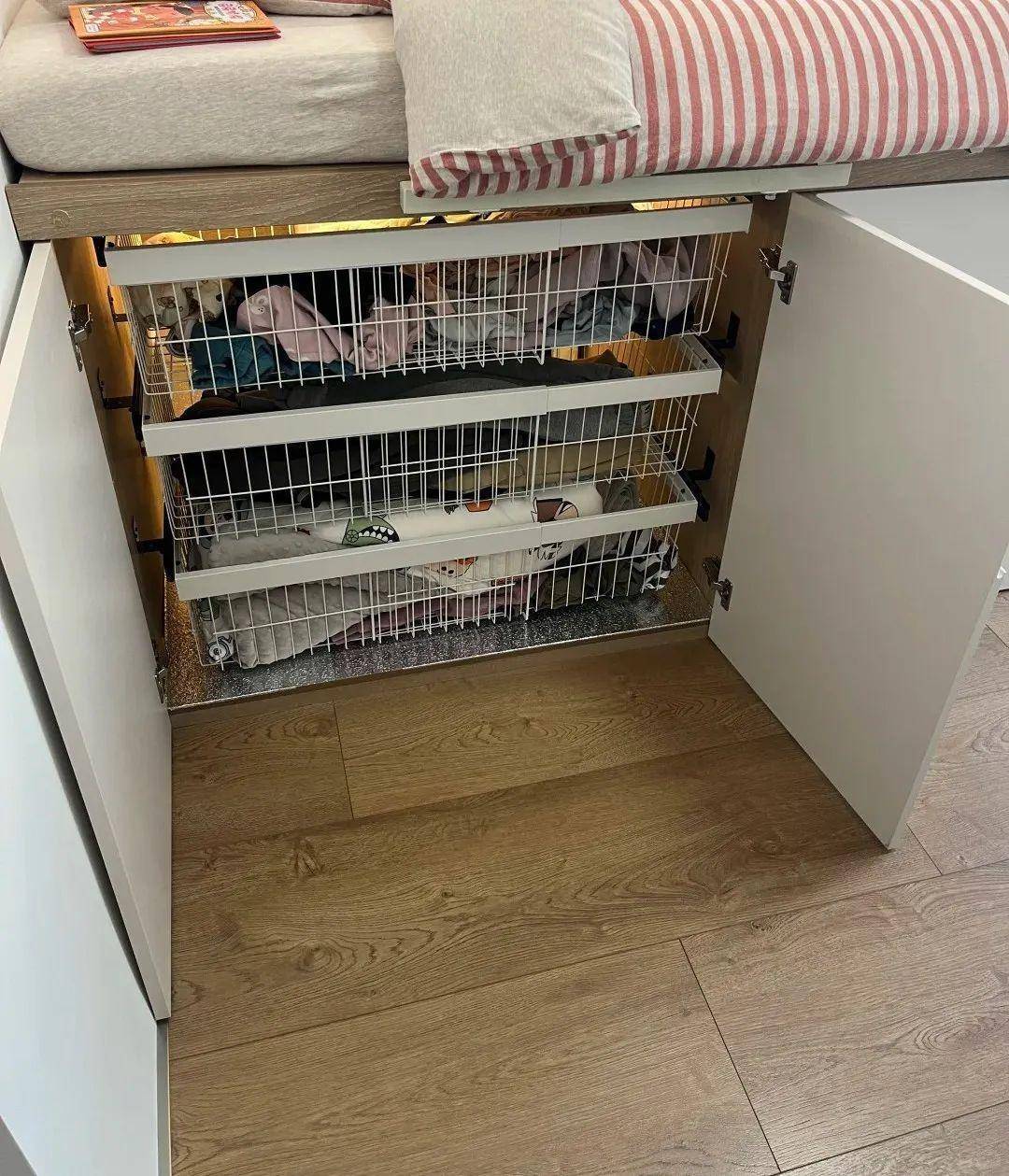 抬高的床底可不是空着积灰的,而是定制了一套 “立体收纳系统”: