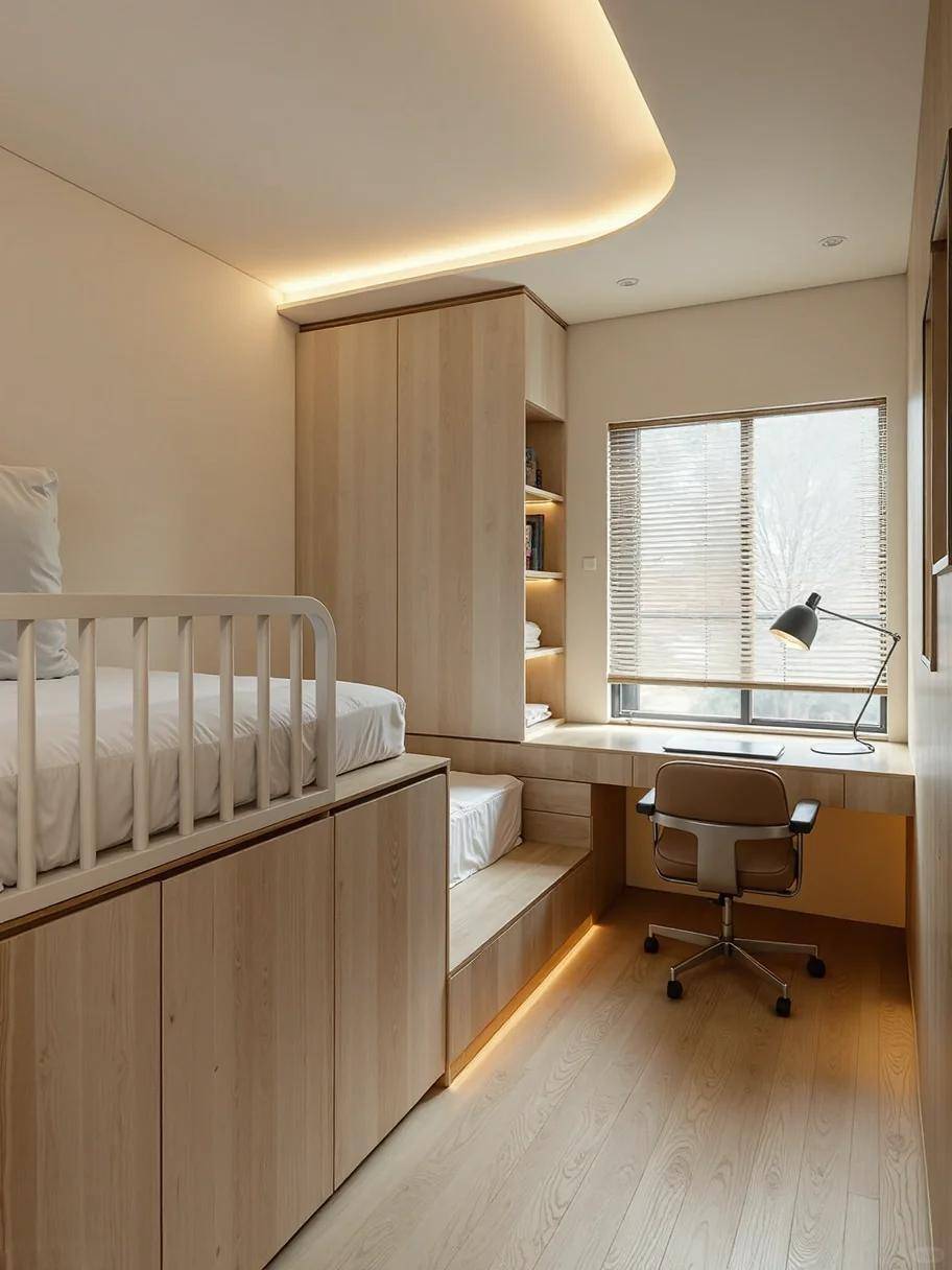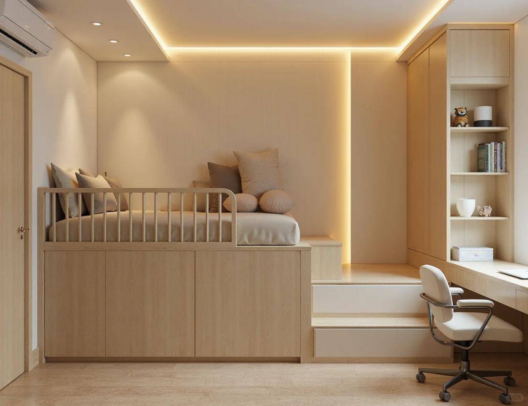 传统卧室里,床占了大半空间,地面被牢牢 “霸占”。不如把床整体抬高 90 公分,床架外侧用环保木饰面包裹,温润的木质纹理让空间更显温馨,还能避免磕碰。这个高度刚好够一个成年人弯腰进入,既不会太压抑,又能给下方留出充足的利用空间 —— 相当于在床底下 “偷” 出了一个隐藏区域,原本浪费的地面瞬间变成实用空间。